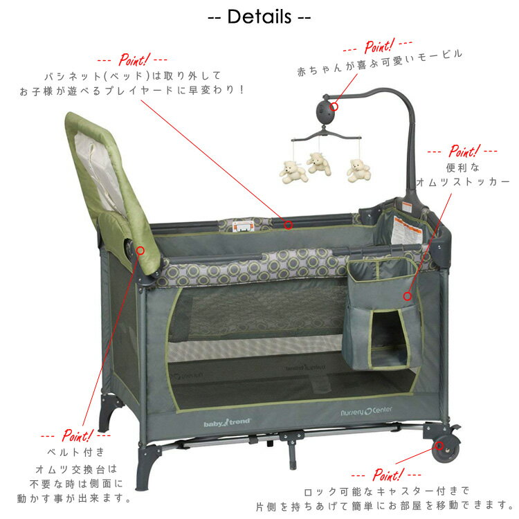 ・お買い物ガイド ・アメリカ製商品について 【検索キーワード】 BabyTrend ベビートレンド ナーサリーセンター プレイヤード ベビー ベビーベッド 添い寝 オムツ替え おむつ交換台 お昼寝 ゆりかご 新生児 出産祝い カラフル ブランド アメリカ プレゼント