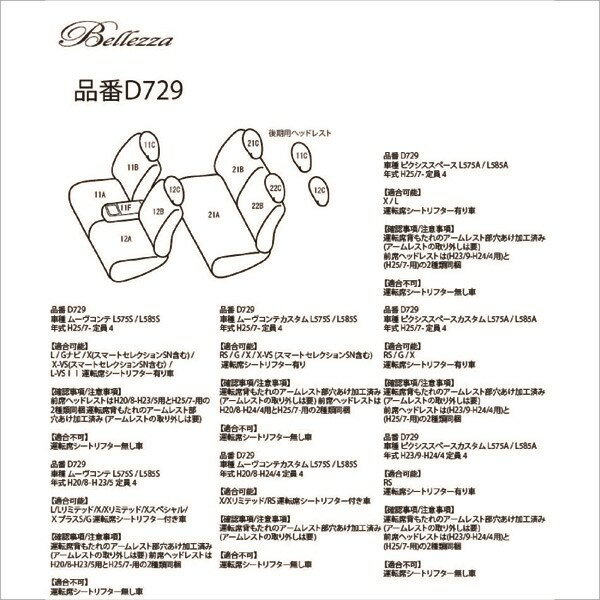 (適合可能)【型式】L575S/L585S ムーヴコンテ【年式】H20/8-H23/5【定員】4人【グレード】L/Lリミテッド/X/Xリミテッド/Xスペシャル/XプラスS/G 運転席シートリフター付き車【注意事項】運転席背もたれのアームレスト部穴あけ加工済み(アームレストの取り外しは要)/前席ヘッドレストはH20/8-H23/5用とH25/7-用の2種類同梱【適合不可】運転席シートリフター無し車(適合可能)【型式】L575S/L585S ムーヴコンテ【年式】H25/7-【定員】4人【グレード】L/Gナビ/X(スマートセレクションSN含む)/X-VS(スマートセレクションSN含む)/L-VSII 運転席シートリフター有り車【注意事項】運転席背もたれのアームレスト部穴あけ加工済み(アームレストの取り外しは要)/前席ヘッドレストはH20/8-H23/5用とH25/7-用の2種類同梱【適合不可】運転席シートリフター無し車(適合可能)【型式】L575S/L585S ムーヴコンテカスタム【年式】H20/8-H24/4【定員】4人【グレード】X/Xリミテッド/RS 運転席シートリフター付き車【注意事項】運転席背もたれのアームレスト部穴あけ加工済み(アームレストの取り外しは要)/前席ヘッドレストはH20/8-H23/5用とH25/7-用の2種類同梱【適合不可】運転席シートリフター無し車(適合可能)【型式】L575S/L585S ムーヴコンテカスタム【年式】H25/7-【定員】4人【グレード】RS/G/X/X-VS(スマートセレクションSN含む) 運転席シートリフター有り【注意事項】運転席背もたれのアームレスト部穴あけ加工済み(アームレストの取り外しは要)/前席ヘッドレストはH20/8-H23/5用とH25/7-用の2種類同梱【適合不可】運転席シートリフター無し車(適合可能)【型式】L575A/L585A ピクシススペース【年式】H25/7-【定員】4人【グレード】X/L/運転席シートリフター有り車【注意事項】運転席背もたれのアームレスト部穴あけ加工済み(アームレストの取り外しは要)/前席ヘッドレストはH20/8-H23/5用とH25/7-用の2種類同梱【適合不可】運転席シートリフター無し車(適合可能)【型式】L575A/L585A ピクシススペースカスタム【年式】H23/9-H24/4【定員】4人【グレード】RS/運転席シートリフター有り車【注意事項】運転席背もたれのアームレスト部穴あけ加工済み(アームレストの取り外しは要)/前席ヘッドレストはH20/8-H23/5用とH25/7-用の2種類同梱【適合不可】運転席シートリフター無し車(適合可能)【型式】L575A/L585A ピクシススペースカスタム【年式】H25/7-【定員】4人【グレード】RS/G/X/運転席シートリフター有り車【注意事項】運転席背もたれのアームレスト部穴あけ加工済み(アームレストの取り外しは要)/前席ヘッドレストはH20/8-H23/5用とH25/7-用の2種類同梱□サイズ(cm)WxDxH:66x53x37□重さ(kg):10ご購入前に、車両型式、エンジン型式、駆動方式、年式、グレード、シート形状等をご確認頂き、メーカーHPで車両適合に誤りがないか必ずご確認下さい。
